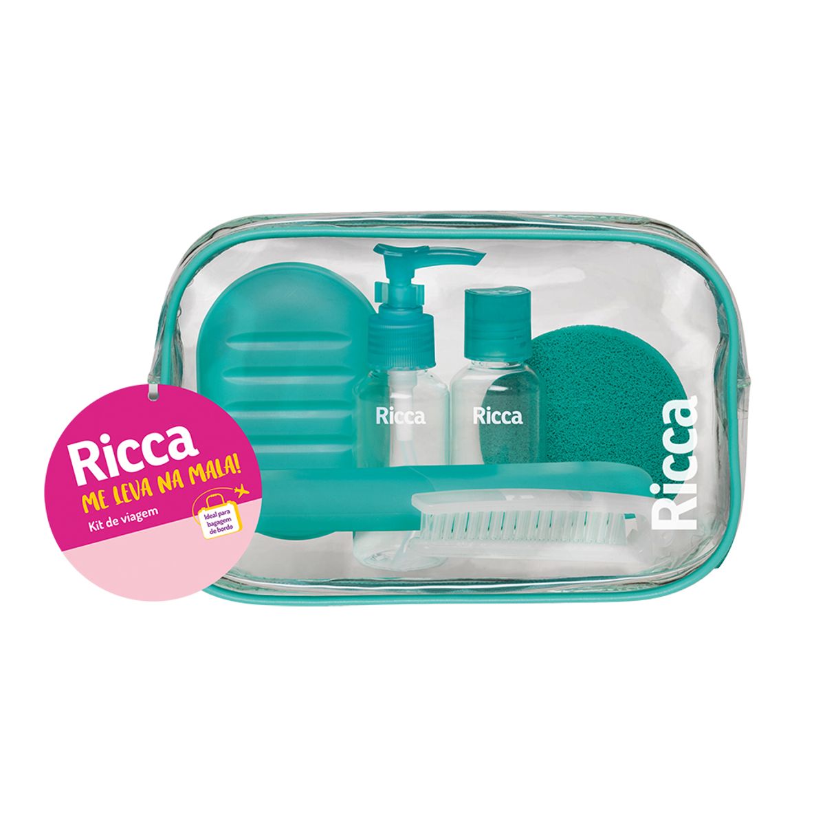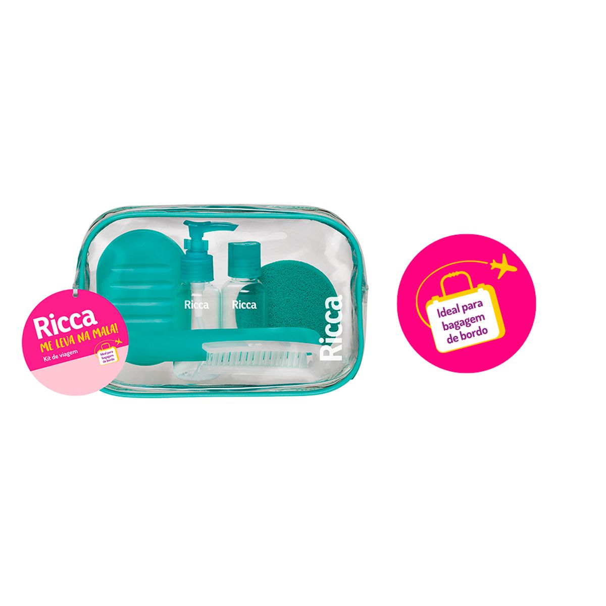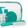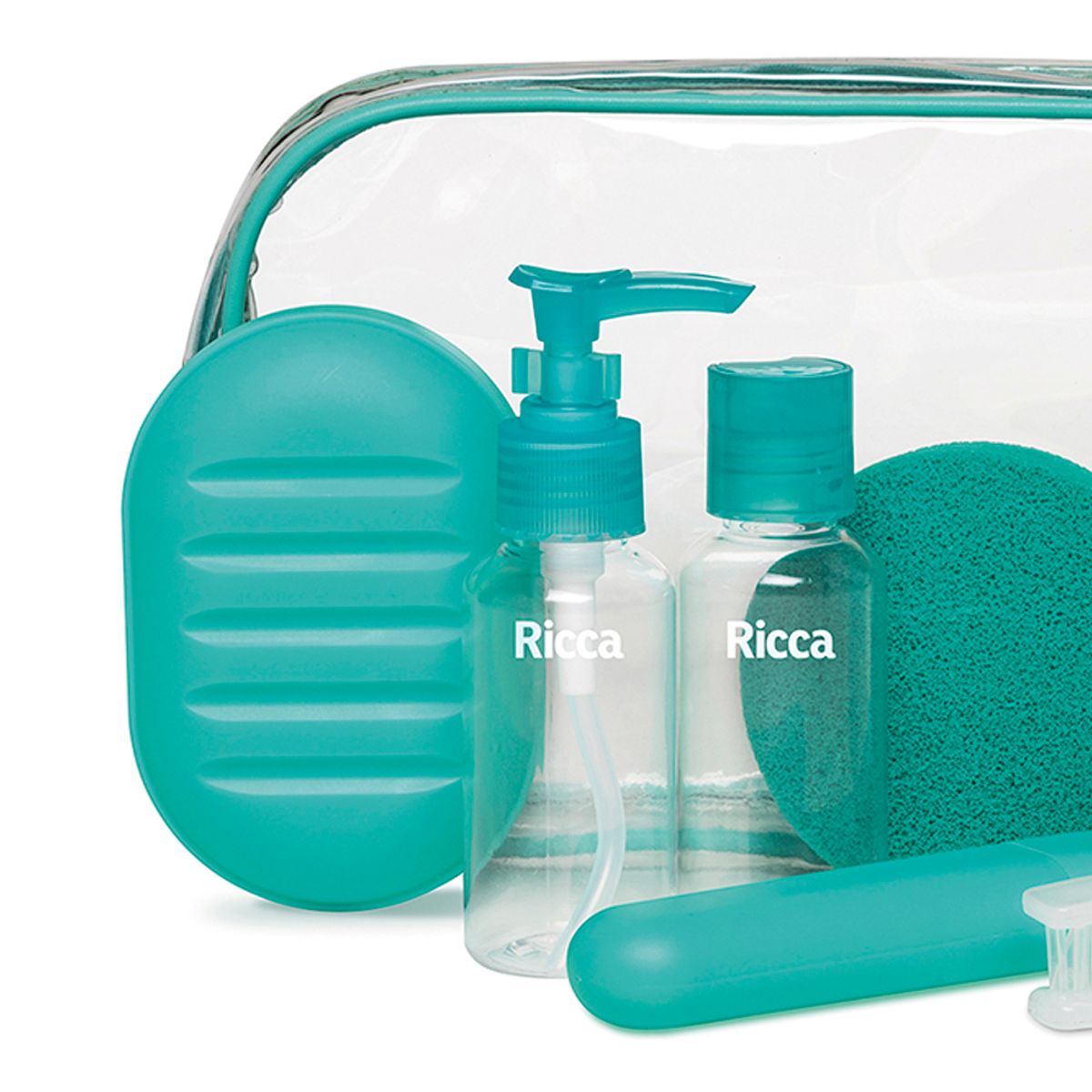 Esse kit lindo vem com esponja soft, saboneteira, porta escova de dente, dois frascos de 80ml com tampa válvula e tampa abre e fecha e pente dobrável.