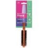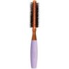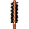 Escova redonda de madeira com base de alumínio e cerdas naturais de javali intercaladas com pinos de nylon. A base de alumínio aquece rapidamente com o calor do secador acelerando o processo de alisamento.