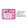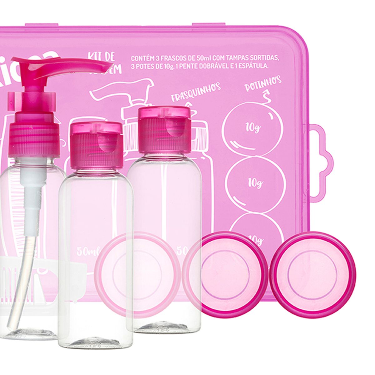 Como usar: Use os compartimentos do kit para organizar seus frascos e produtos de higiene pessoal. A praticidade de transportar seus cosméticos nunca foi tão fácil!
